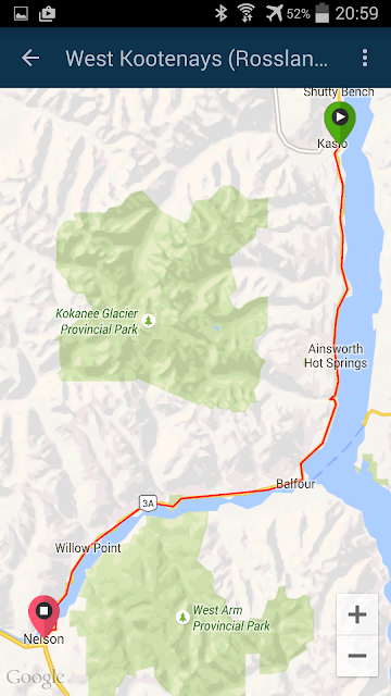 Wednesday was a rest day in Nelson. Jen went out for a long walk on a path that runs along the lake, while the boys went to a local bike shop to get new tires for Pat's bike. Then we spent the rest of the day taking in the "local color" in the downtown area. Nelson got its start as a haven for American draft evaders during Vietnam, so the whole town has that peace, love, and happiness vibe. There is also a great little foodie scene, and we found shops with great cheeses and breads, and of course, beer. There may have been an impromptu pre-birthday celebration for Doug's 60th that involved a ridiculous party hat and a lot of belly - laughs. Oh, and there are lots and lots of dogs in this town, which of course made us happy. ;)